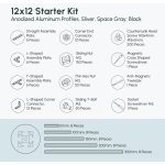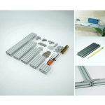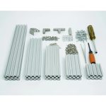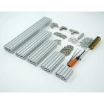 FuturoFrame’s 12×12 Small T-slot Starter Kit consist of 40 miniature aluminum profiles beams (8x300mm, 8x200mm, 8x150mm, 8x100mm, 8x50mm), 30 brackets (6 straight brackets, 6 L-shaped brackets, 6 T-shaped brackets, 12 L-corner connectors), 12 corner end connectors, 150 sliding nuts (M3), 150 countersunk head screws (M3x4), 50 countersunk head screws (M3x5, for corner end connectors), 50 sliding T-bolts (M3), 50 hex thin nuts (M3), 1 socket screwdriver (M3), 1 magnetic cross shaped screwdriver, and 1 anti-magnetic tweezer; additional elements can be ordered individually.