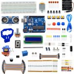The Adeept Ultrasonic Distance Sensor Starter Kit with Uno R3 features a distance sensor, servo, and motor and includes the Adeept Uno R3 microcontroller. Also, many buttons, LEDs, capacitors and jumper wires are contained in the Adeept starter kit.