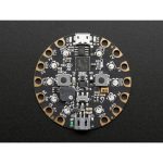 The board is round and has alligator-clip pads around it so you don’t have to solder or sew to make it work. You can power it from USB, a AAA battery pack, or with a Lipoly battery (for advanced users).
