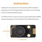 The Hiwonder MP3 Module Programming Music Player w/ TF Card Support & MP3/WAV Decodingcan be controlled via IIC communication. It is user friendly and the volume can be adjusted to 30 different levels. The 4 pin connector makes wiring simple and straightforward.