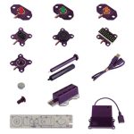 The pack comprises of an Invention Engine Hub, a Digital Display bit, a Speaker bit, a Proximity sensor, and LED bits in green, red, and orange. It also includes a Button bit with a white button cap, a Battery box, a Battery bit pouch, a Punch tool, a Stencil, a USB extender cable, and 35 Rivets.