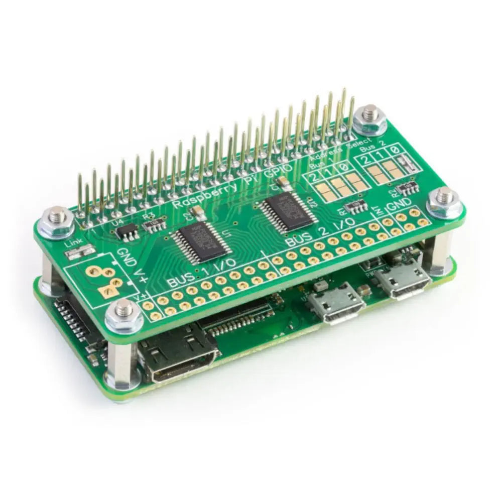 The IO Zero 32 HAT for Raspberry Pi Zero is a 32-channel digital expansion board designed for use on the Raspberry Pi. The board is based around the PCA9535 16-bit I/O expander from NXP. A pair of PCA9535 expanders are included on the board allowing you to connect up to 32 digital inputs or outputs to the Raspberry Pi.