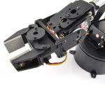 The aluminum robotic arm is made from Servo Erector Set components for the ultimate in flexibility and expandability. The kit consists of black anodized aluminum brackets, Aluminum tubing and hubs, custom injection molded components, and precision laser-cut Lexan components. The arm uses 1 x HS-485HB in the base, 1 x HS-805BB in the shoulder, 1 x HS-755HB in the elbow, 1 x HS-645MG in the wrist, and 1 x HS-422 in the gripper.