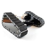The robot chassis is made from ultratough lasercut Lexan structural components, and custom aluminum brackets. By utilizing heavy duty polypropylene and rubber tracks with durable ABS molded sprockets the robot has excellent traction. It includes two 12vdc 50:1 gear head motors.