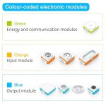 The Makeblock Neuron Artist Kit features 8 Electronic blocks and guides, Master Science Through Playing: Each block comes with a guide. The guide tells children what the working principles are, how the block is useful and how to code the block.