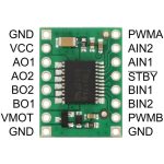 The Pololu Dual DC Motor Driver 1A, 4.5V-13.5V- TB6612FNG is perfect for controlling two bidirectional DC motors or one bipolar stepper motor. This tiny board is an easy way to use Toshiba’s TB6612FNG dual motor driver. A recommended motor voltage of 4.5 – 13.5 V and peak current output of 3 A per channel (1 A continuous) make this tiny board a great motor driver for low-power motors. This dual motor driver has a built-in thermal shutdown circuit and maximum PWM frequency is 100 kHz. This little breakout board gives you direct access to all of the features of the TB6612FNG and adds power supply capacitors and reverse battery protection on the motor supply (note: there is no reverse protection on the Vcc connection).