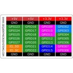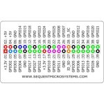 Laminated plastic, credit-card size index card shows all the terminal block connections. Raspberry Pi GPIO pins are brought out grouped by functions and color-coded.