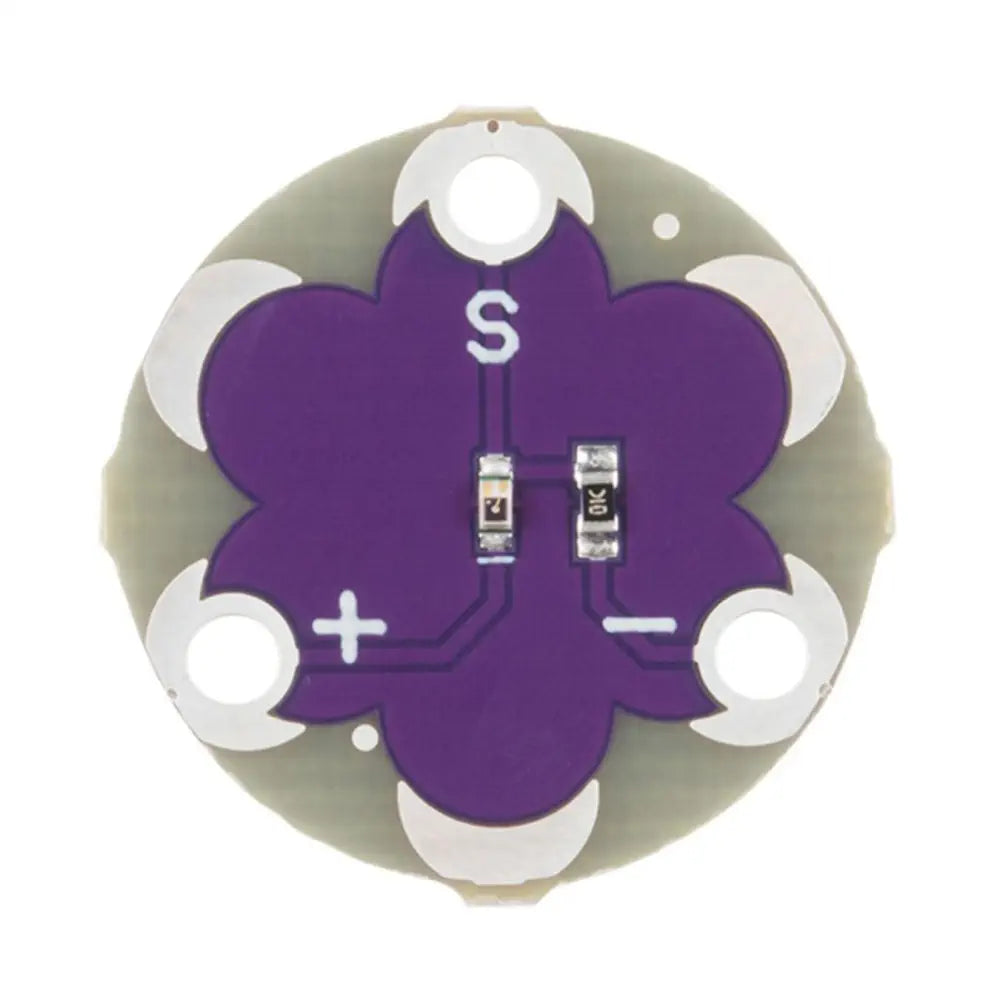 The SparkFun LilyPad Light Sensor is a sewable breakout board with an ALS-PT19 light sensor built in and ready to use right away. Each sensor outputs voltage between 0V and 3.3V depending on the level of ambient light shining on it. As more light is applied on the sensor, more current will flow from the board through the signal tab to the microcontroller you connect the sensor to. If the sensor receives no light, no current will flow through it. In a typical indoor lighting situation, the sensor will output around 1 to 2V. Adding this board into your next e-textile or wearable project will really open up the possibilities by being able to incorporate light level sensing capabilities.