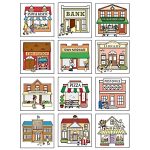 Images are taken from the Community Mat and include a school, library, police station, store, and pizza parlor. Students may use the three blank boxes to create buildings of their own, drawing on them or pasting photos or images, allowing them to customize the 3D community as they learn.